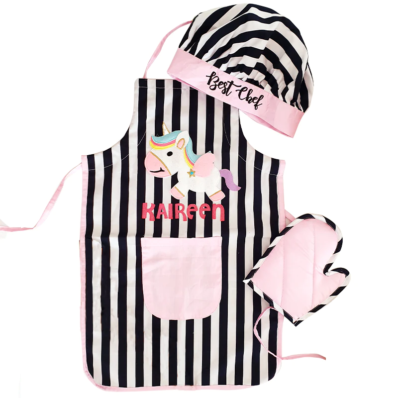 Introducing Rosada Black White Unicorn Cotton Apron Set, perfect for kids! Buy these aprons are personalized, making them great photography accessories for birthday photo shoots.