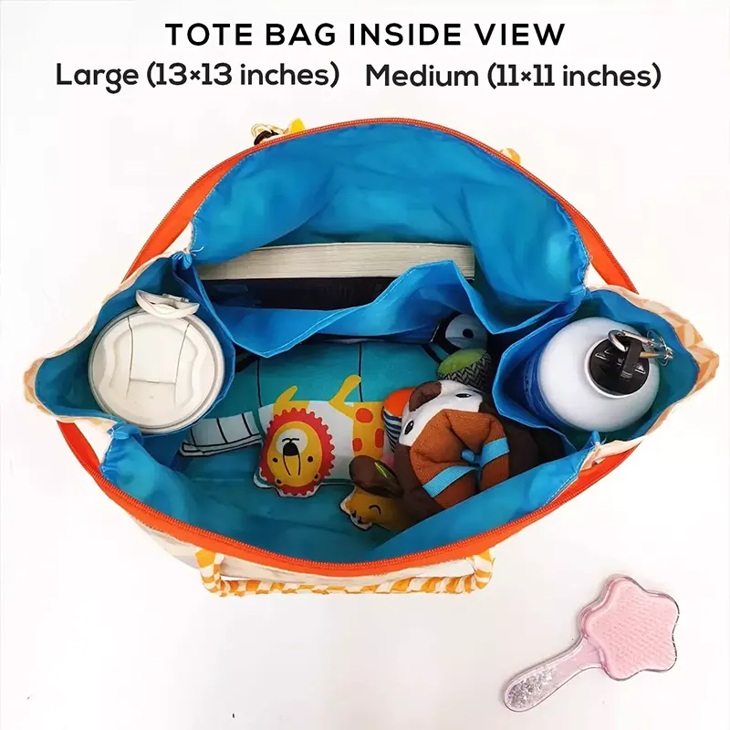 Introducing the Tote Bags for Kids! Perfect for any outing or school activity, this tote bag is designed to make life easier for kids and moms. It features one main compartment with a zip closure and three side compartments, providing plenty of space for your little one’s necessities. This bag covers you, whether it’s carrying snacks, books, or toys. Plus, it’s made with waterproof fabric that will keep your kid’s belongings safe and secure. So if you’re looking for a stylish and functional bag that you or your kid can carry, Tote Bags is the choice!